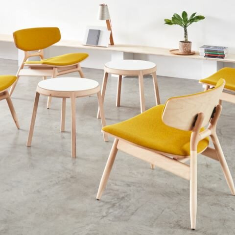 Kolekcia stoličiek, kresiel a podnožiek s podnožou z bukového dreva. Operadlo a sedadlo z bukovej dosky, čalúnené alebo čalúnené na jednej strane, čo spolu so svojou štruktúrou bez okrajov dodáva Eco teplé a príjemné sedadlo.