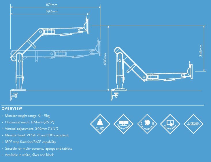 Držiak Ollin je určený pre jednu obrazovku / monitor, avšak vďaka svojmu dômyselnému dizajnu je možné ho ľahko upraviť tak, aby držal notebook prípadne tablet. Obrazovku ľahko umiestnite presne tam, kde ju budete potrebovať.