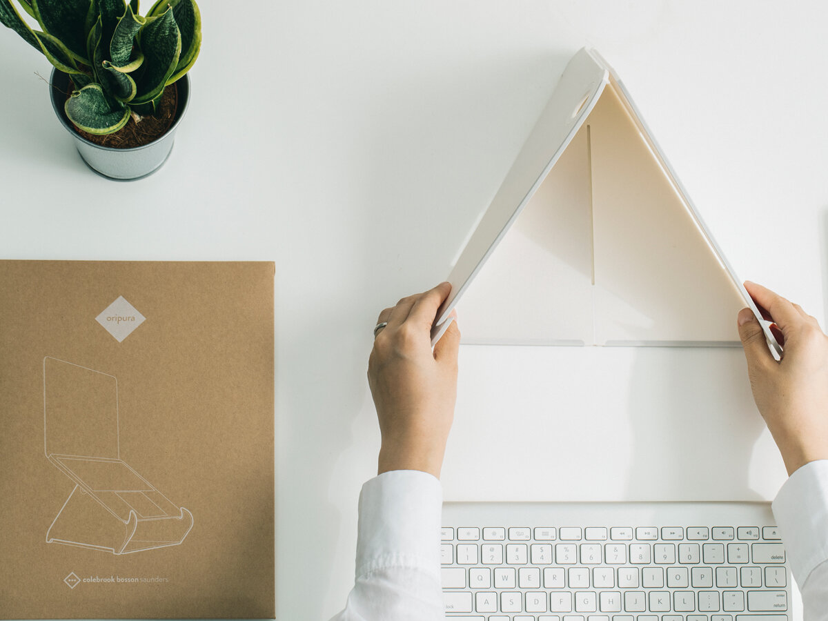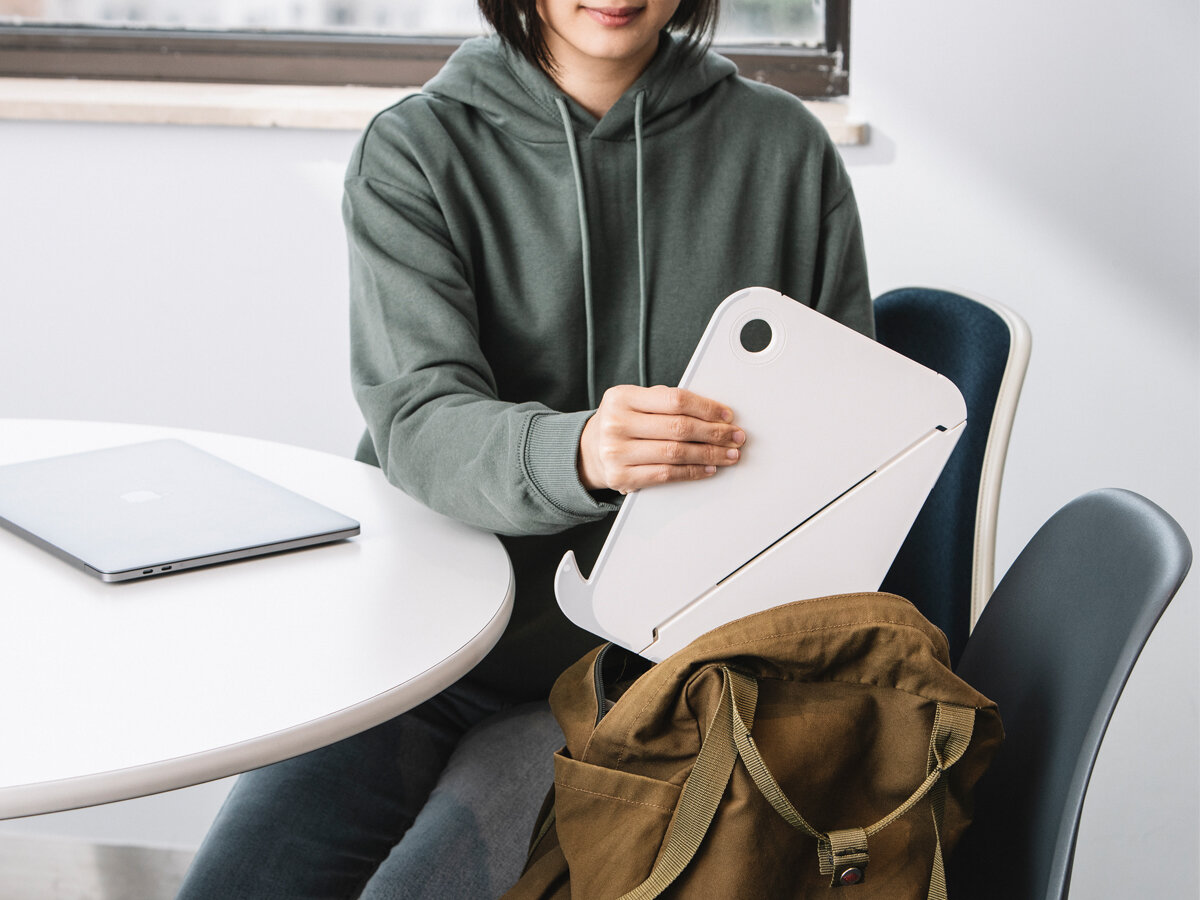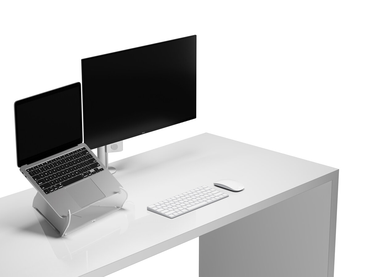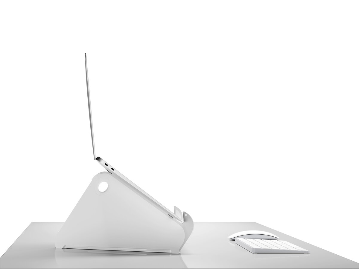 Je prenosný, skladací a ideálny na vytvorenie ergonomickej pracovnej stanice v kancelárii, pri práci z domu, alebo na cestách. Jeho zvýšený uhol a otvorený dizajn podporujú dobré prúdenie vzduchu, aby sa predišlo prehrievaniu notebookov a vďaka vstavanému manažmentu káblov pomáha udržiavať rušné stoly čisté a upratané. Navyše, jeho háčiky môžu slúžiť aj ako držiak dokumentov.