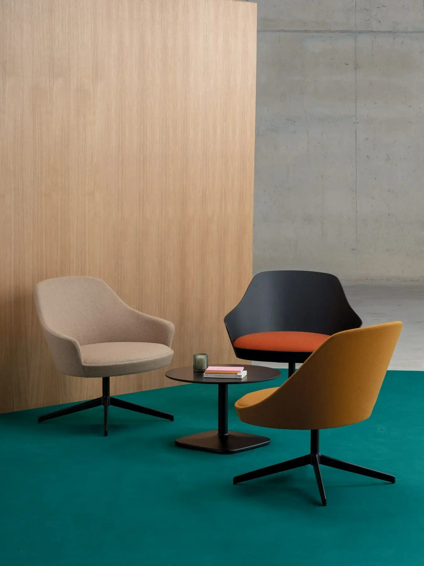 Kreslo Kaiak lounge, dostupné s podrúčkami alebo bez nich, je vyrobené z prírodného alebo moreného dubového dreva. Jeho otočná konštrukcia môže byť lakovaná v dostupných farbách.