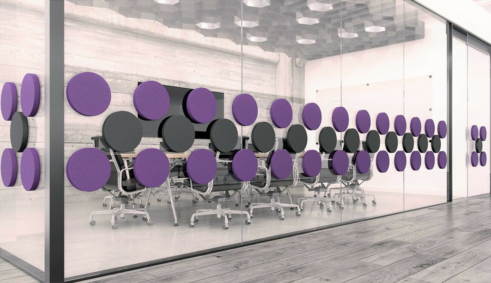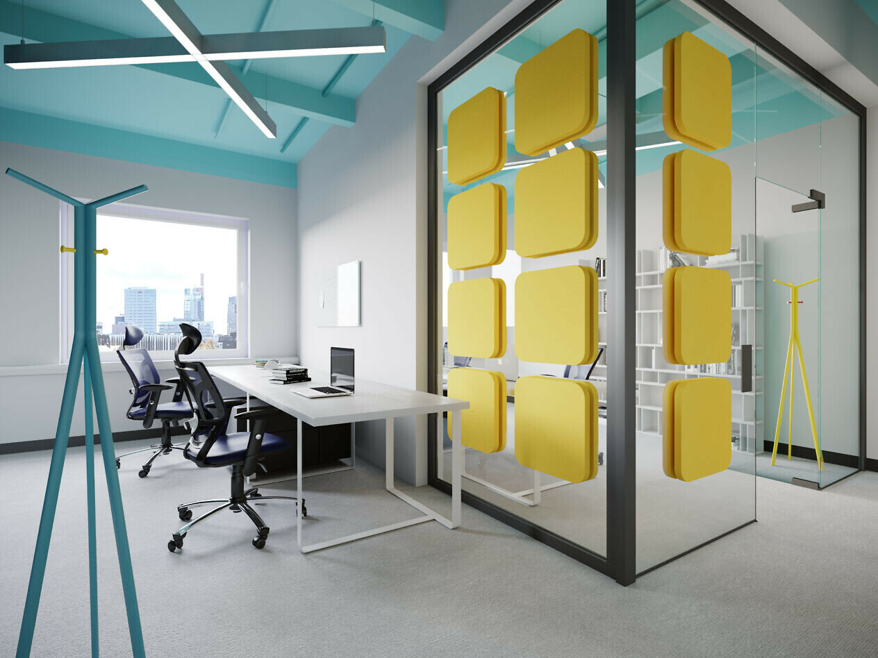 Široká škála farieb a tvarov z nich robí ideálnu, jedinečnú dekoráciu na sklenené steny. Fluffo GLASS pohlcujú zvuk a redukujú ozveny v interiéri, výrazne zlepšia akustiku v presklených konferenčných miestnostiach alebo kanceláriách, kde okná zaberajú veľké plochy. Prísavný montážny systém udrží panely aj na lakovaných MDF, ktoré sa bežne používajú v kancelárskom nábytku.