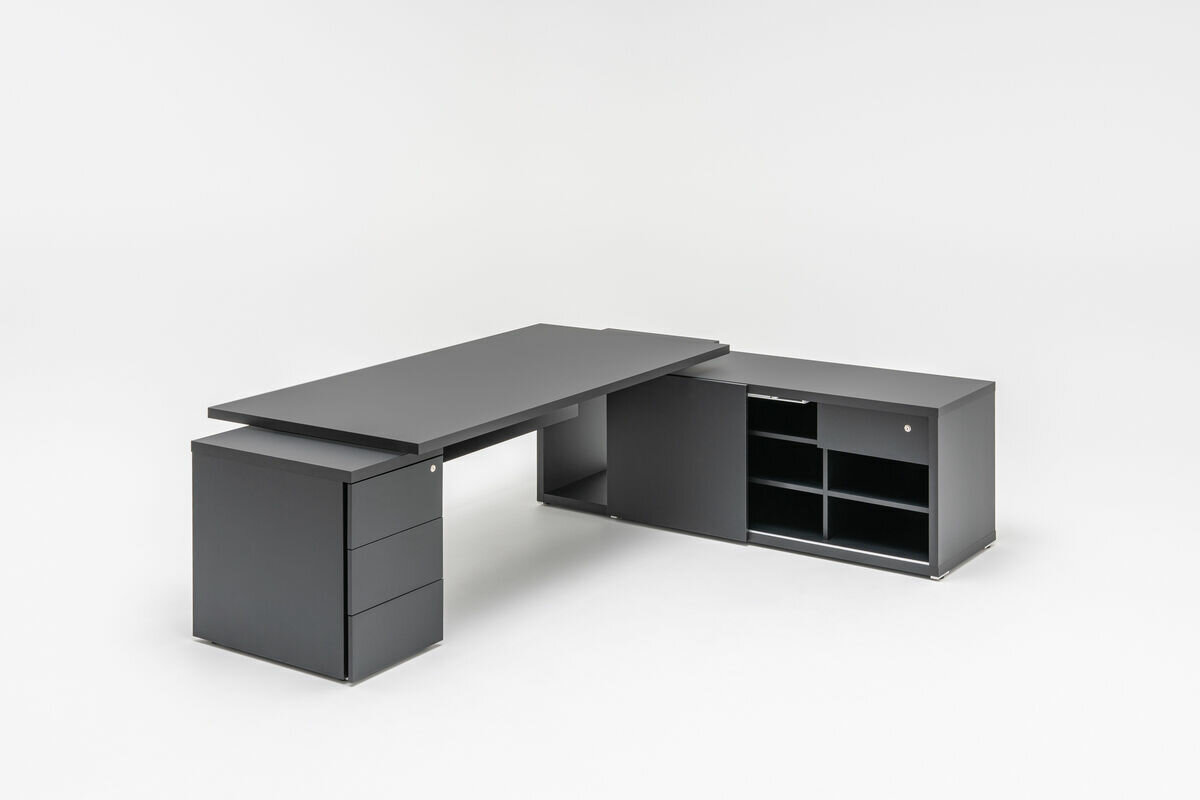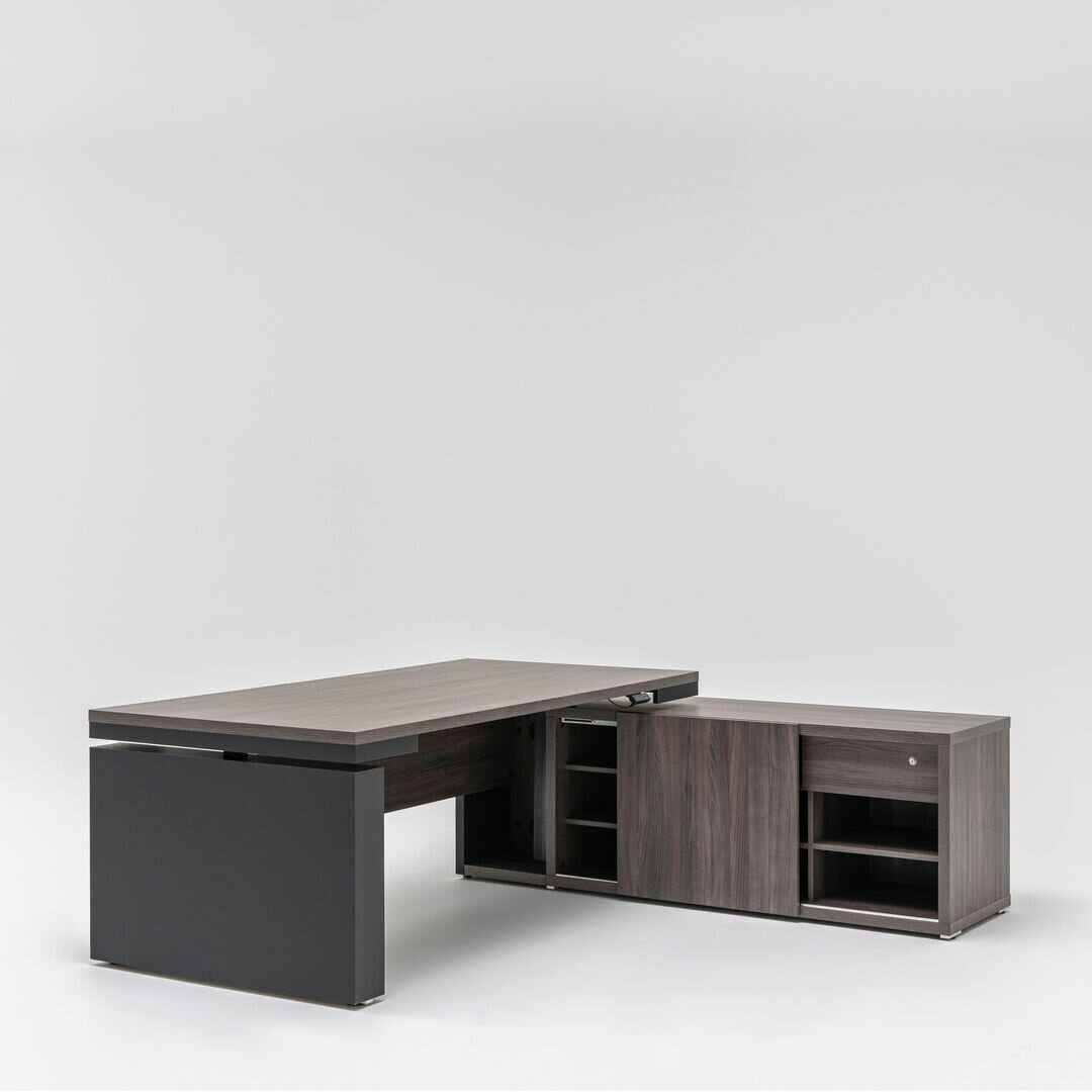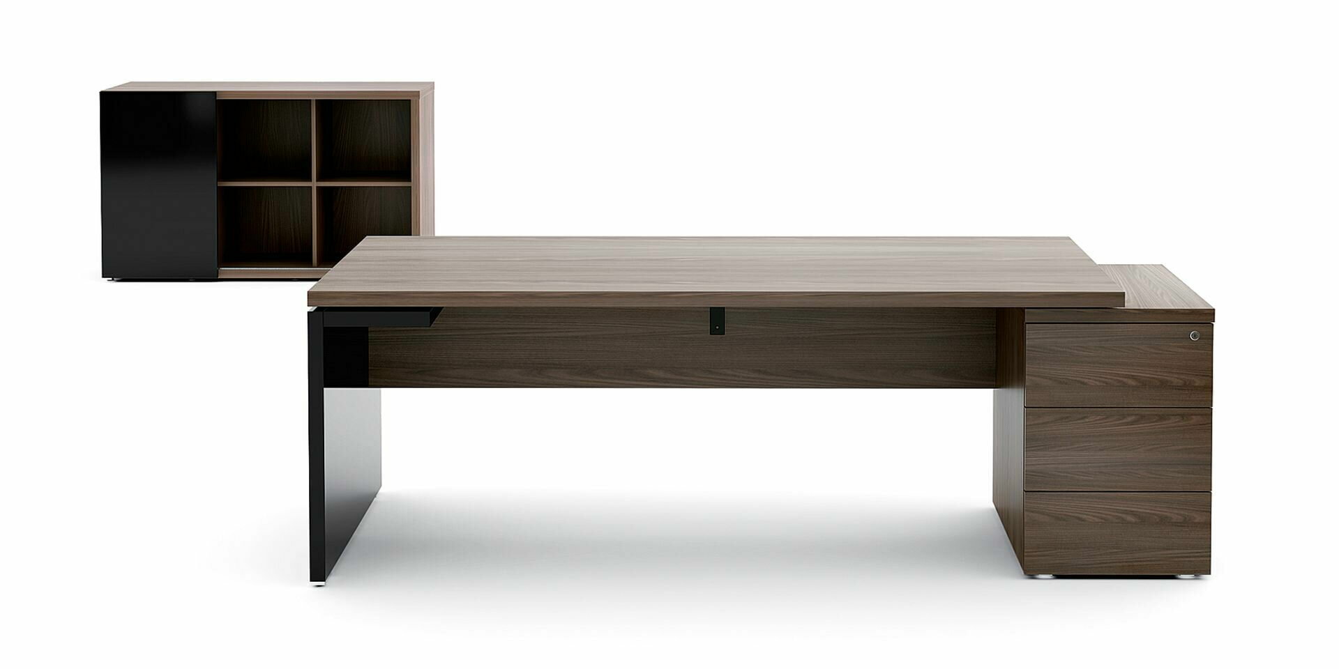Písací stôl Mito je dostupný v dvoch farbách: dub jantárový a robinia, ktoré možno zladiť s bielymi a čiernymi matne lakovanými detailmi, ktoré zdôrazňujú prestíž kolekcie.
