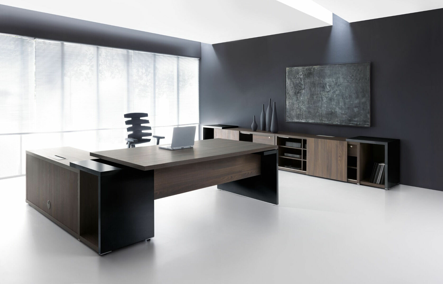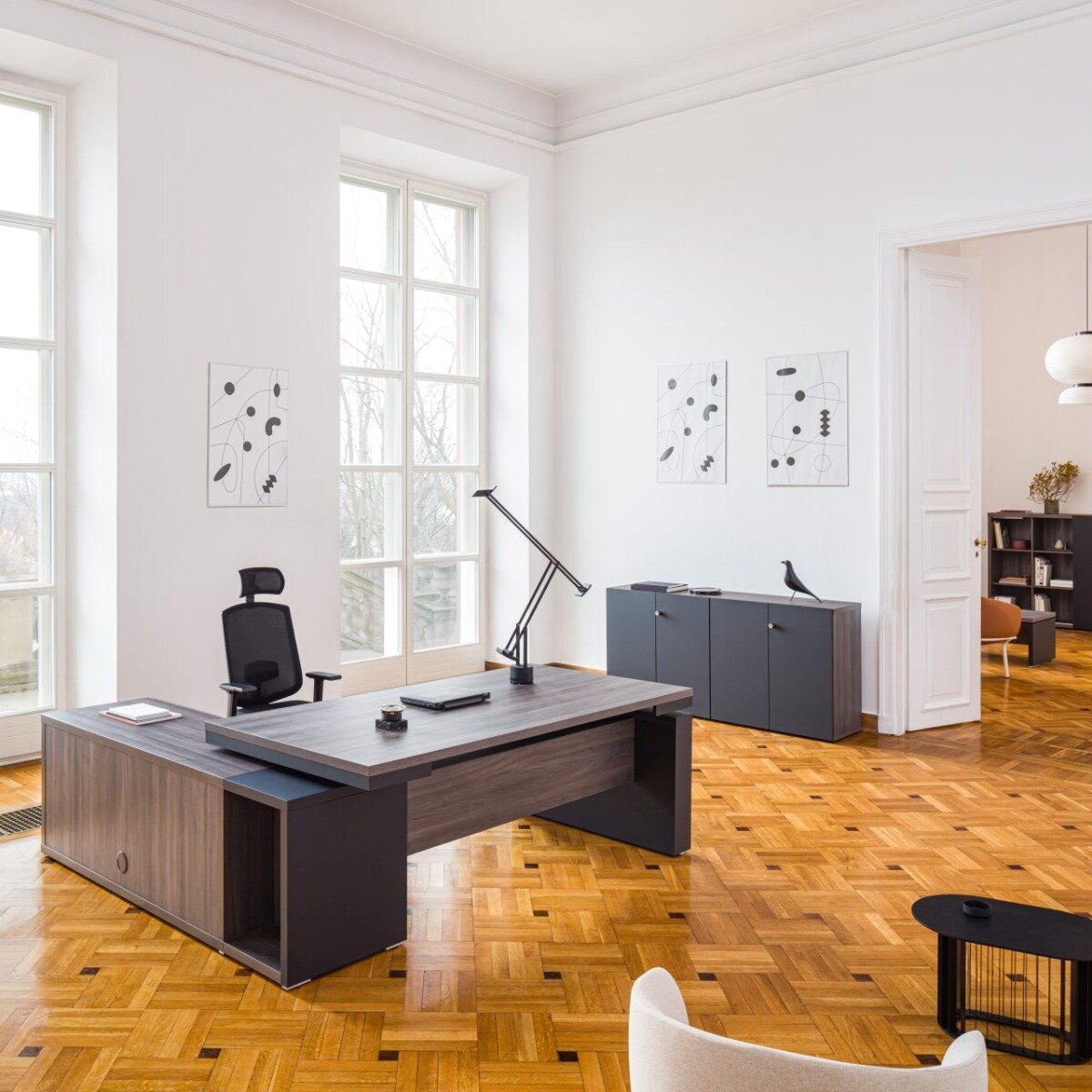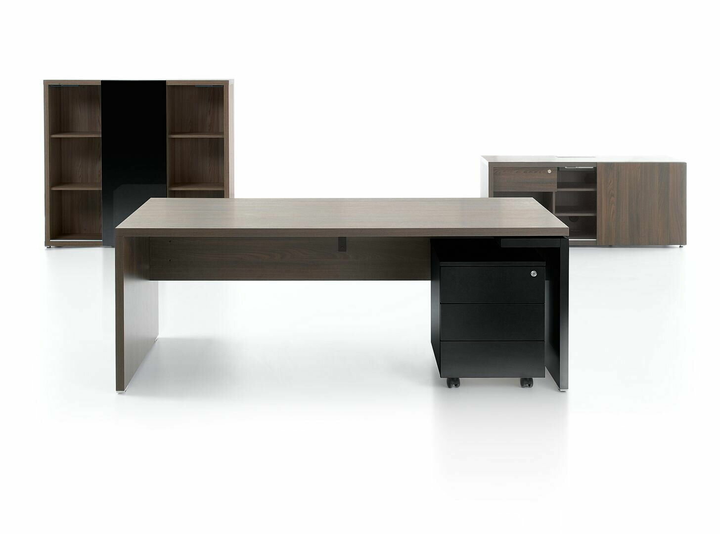 Písací stôl Mito je dostupný v dvoch farbách: dub jantárový a robinia, ktoré možno zladiť s bielymi a čiernymi matne lakovanými detailmi, ktoré zdôrazňujú prestíž kolekcie.